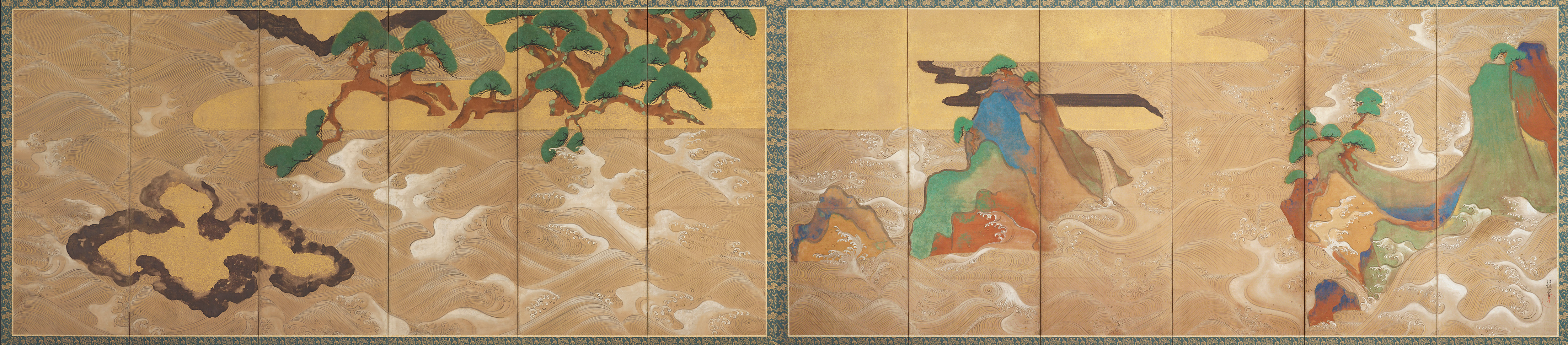 6曲1双 紙本金銀地着色 166 x 369.9 cm(各)。