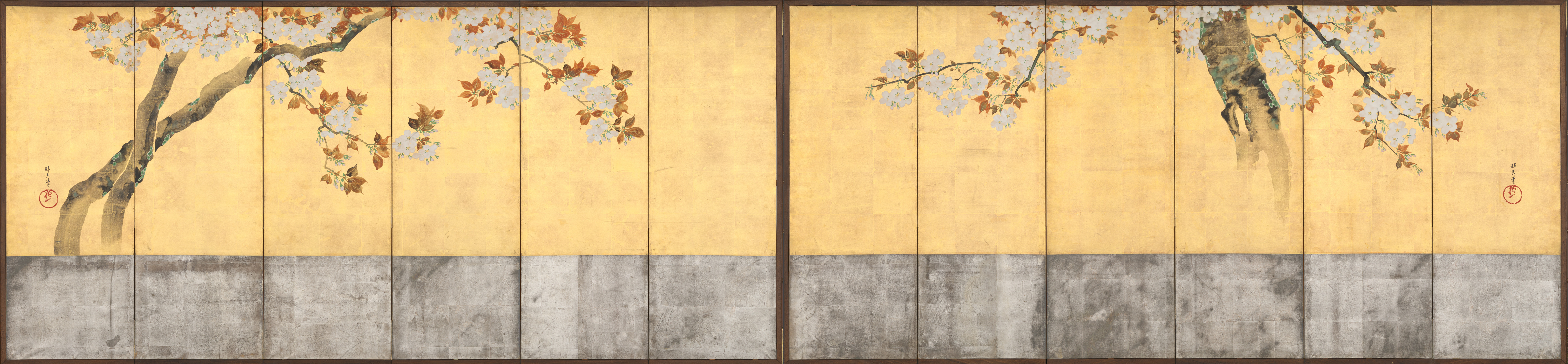 6曲1双 紙本金地着色 96.5 x 208.8 cm.